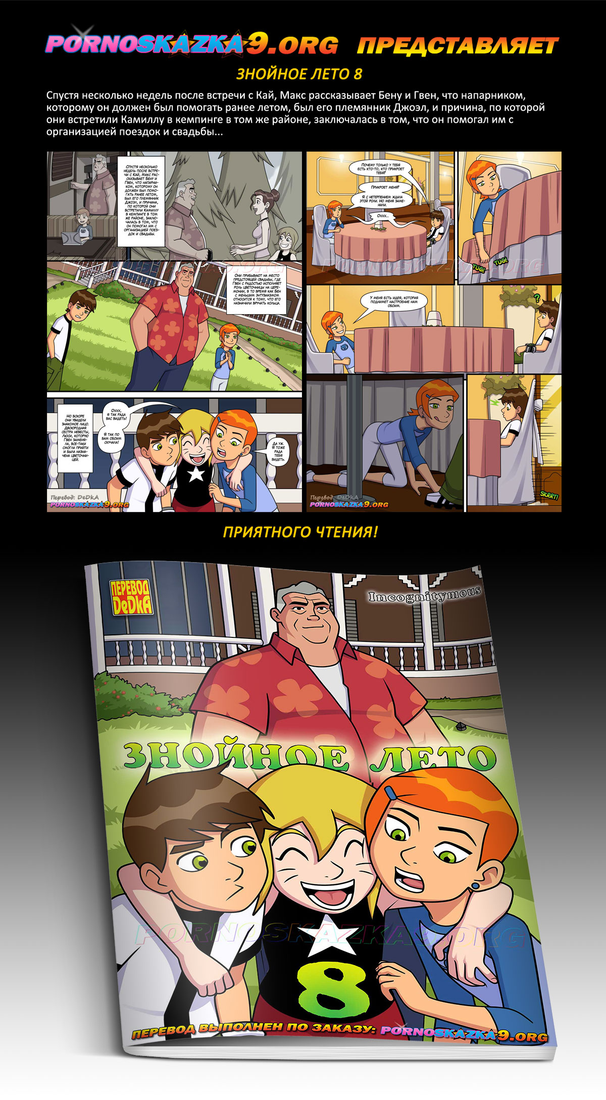 Порно комикс Знойное лето. Часть 8. Спустя несколько недель после встречи с Кай, Макс рассказывает Бену и Гвен, что напарником, которому он должен был помогать ранее летом, был его племянник Джоэл, и причина, по которой они встретили Камиллу в кемпинге в том же районе, заключалась в том, что он помогал им с организацией поездок и свадьбы…